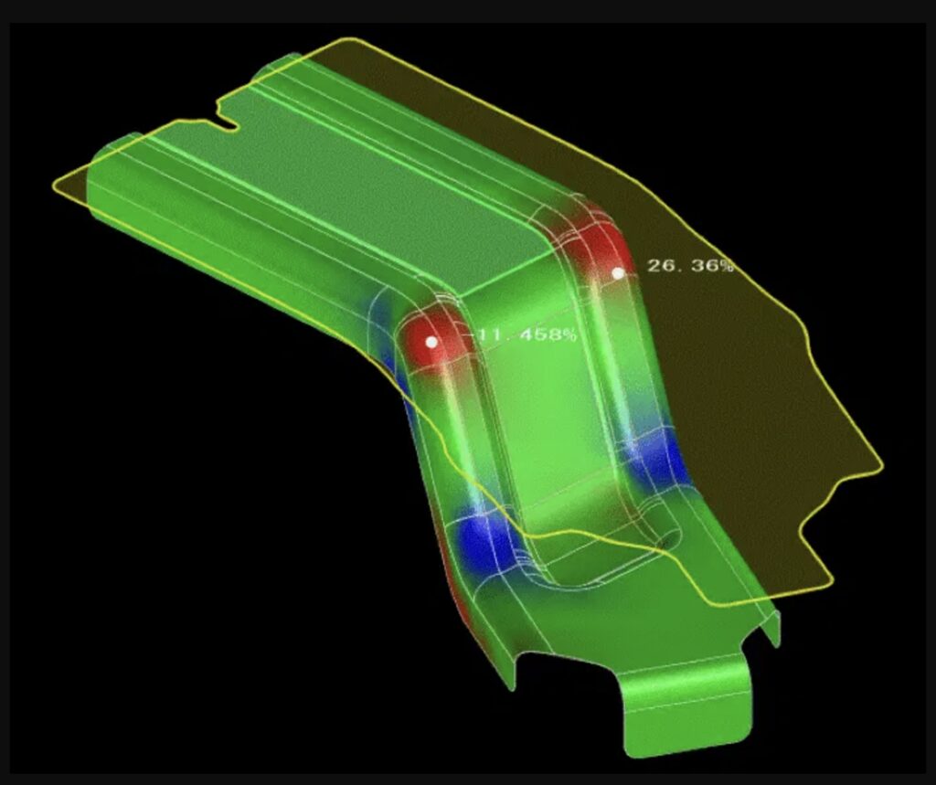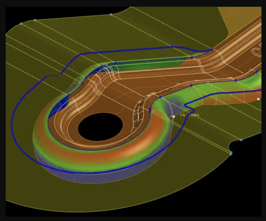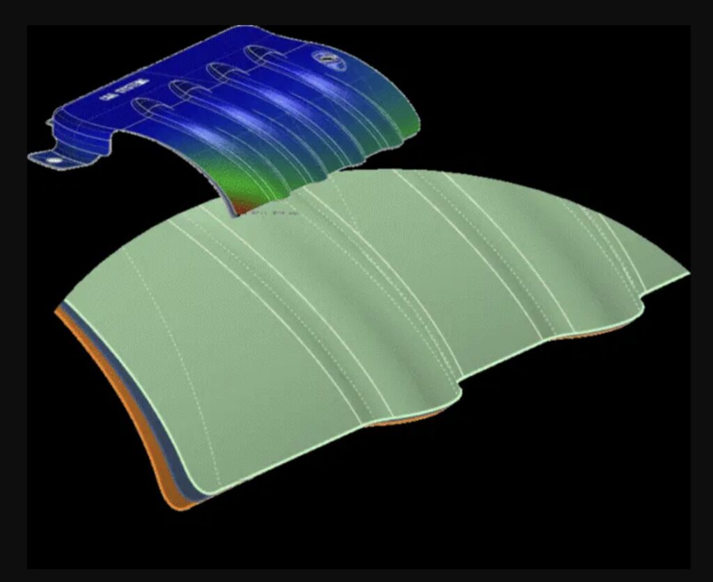เราสามารถคลี่แบบผิวงานของชิ้นงานออกมาได้โดยกำหนดทิศทางและองศาที่ต้องการได้ โดยสามารถใช้พื้นผิว Model เดิมในการคลี่แบบผิวงาน ทำให้การออกแบบ Punch/Die นั้นง่ายขึ้น อีกทั้งยังสามารถเช็คผลลัพท์ค่า ต่างๆ เช่น ค่าความหนาที่เปลี่ยนไปและคุณภาพผิวชิ้นงานจากการเรียงตัวของผิว Meshได้อีกด้วย