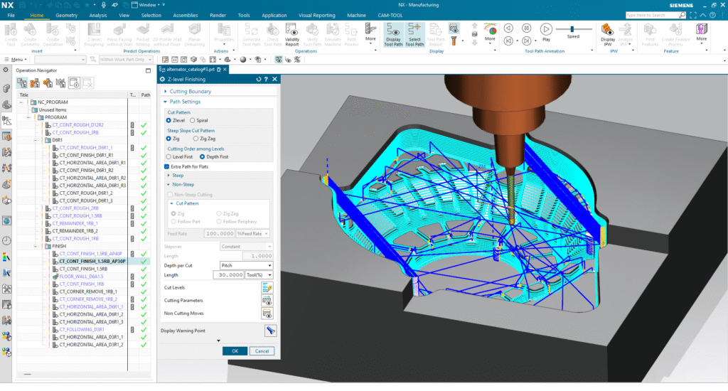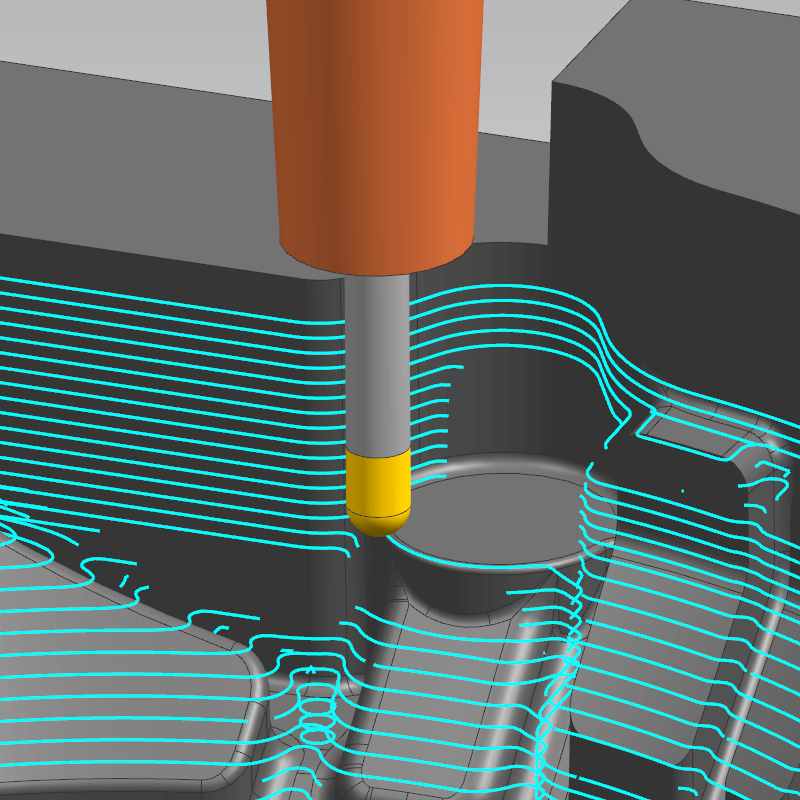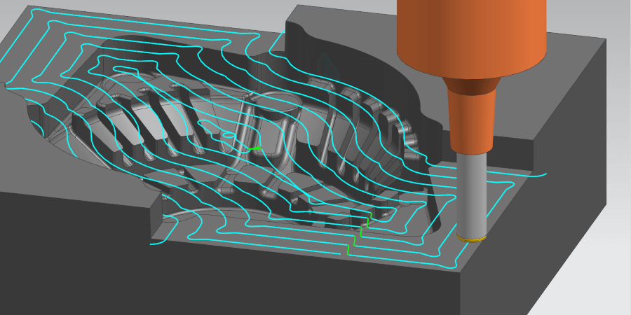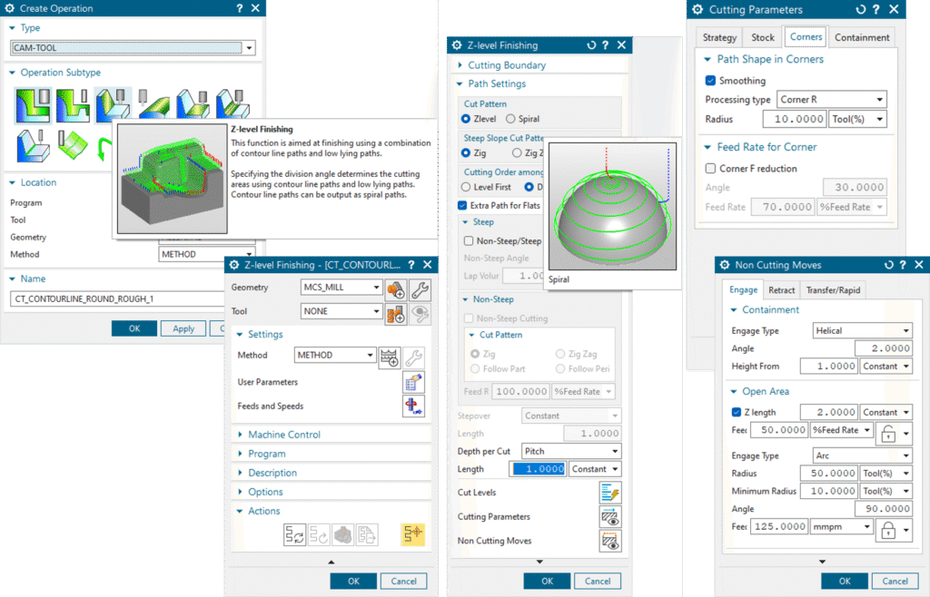 “Z-level Finishing” ซึ่งทำการกัดแบบไต่ระดับ ช่วยให้มั่นใจได้ถึงคุณภาพงานกัดความเร็วสูงและความแม่นยำสูง นอกจากนี้ยังสามารถสร้างเส้นทางเครื่องมือแบบเกลียว ซึ่งช่วยลดการเคลื่อนที่เชื่อมต่อ นี่เป็นวิธีที่ดีที่สุดในการตัดเฉือนแบบอัตโนมัติ เนื่องจากสามารถกัดได้ทั้งพื้นที่ลาดเอียงเล็กน้อยและพื้นที่แนวนอนพร้อมกัน