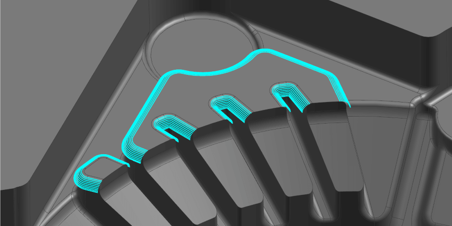 ระบบจะแยกส่วนที่มีความลาดเอียงเล็กน้อยโดยอัตโนมัติตามมุมที่กำหนด และสร้างเส้นทางเครื่องมือจากจุดนั้น ผู้ใช้สามารถเลือกประเภทการเคลื่อนที่เป็น “การสแกน” หรือ “เส้นทางออฟเซ็ต” (รอบพื้นที่) เพื่อให้สามารถตัดเฉือนได้อย่างมีประสิทธิภาพตามคุณสมบัติ “Shape to machine”