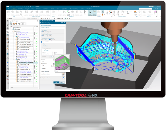 อินเทอร์เฟซผู้ใช้ “CAM-TOOL for NX” สอดคล้องกับการทำงานของ NX CAM และมอบสภาพแวดล้อมการทำงานที่สอดคล้องกันสำหรับผู้ใช้ การทำงานร่วมกันอย่างใกล้ชิดยังช่วยให้คุณสามารถผสมผสานโหมดการทำงานแบบ NX CAM ทำให้สามารถใช้ประโยชน์จากฟีเจอร์หลักของ NX ได้ เช่น การแก้ไขเส้นทางเครื่องมือ ข้อมูลเครื่องมือ การจำลองเครื่องจักร และข้อมูลการผลิต (PMI)