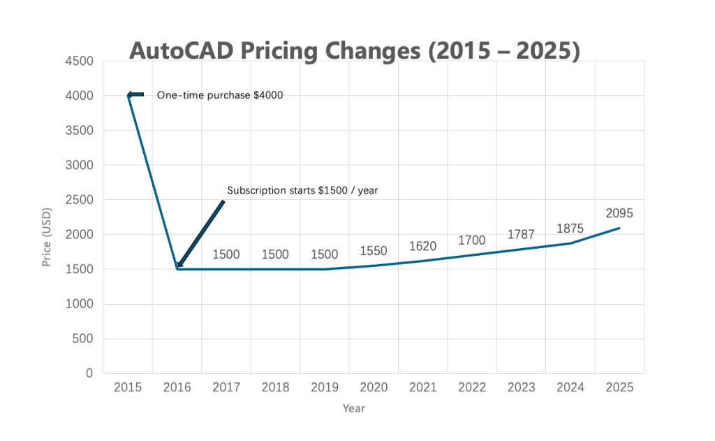 เมื่อมองย้อนกลับไปที่ประวัติการกำหนดราคาของ AutoCAD เผยให้เห็นการเปลี่ยนแปลงครั้งสำคัญในรูปแบบการจัดซื้อซอฟต์แวร์ในช่วงทศวรรษที่ผ่านมา
