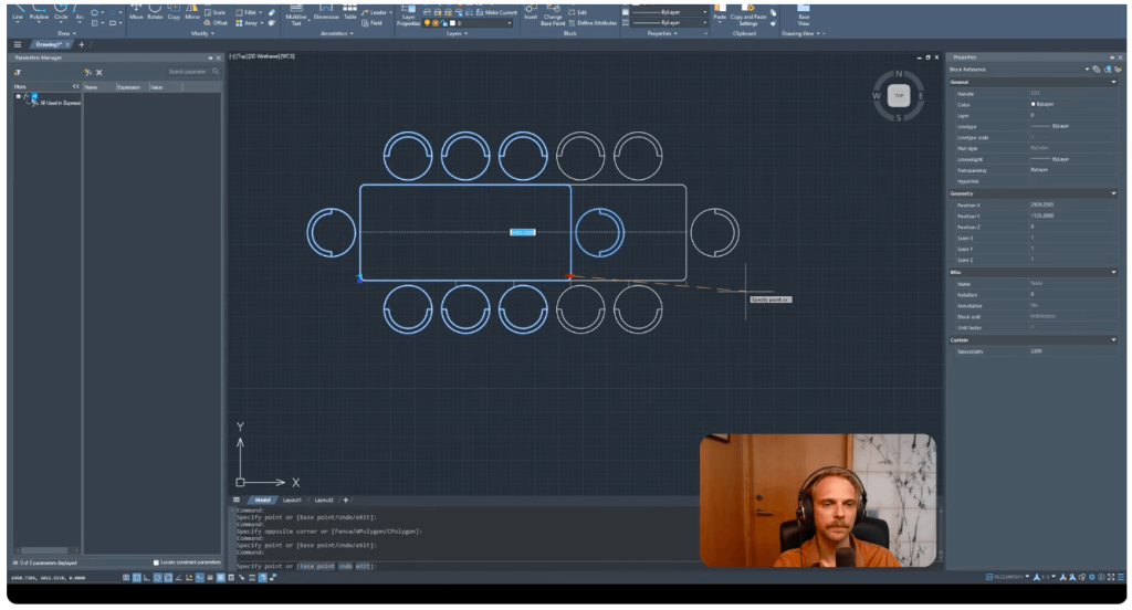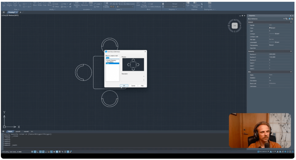 เขาเริ่มต้นด้วยการวาดโต๊ะพร้อมเก้าอี้ให้ครบชุด จากนั้นแปลงการจัดวางทั้งหมดให้เป็นบล็อก ในขั้นตอนนี้ บล็อกจะไม่มีคุณสมบัติแบบไดนามิก และสามารถเคลื่อนย้าย หมุน หรือปรับขนาดได้เท่านั้น