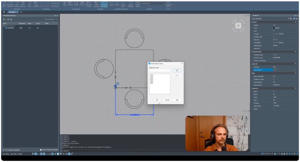 เพื่อให้เป็นพารามิเตอร์ เขาเข้าสู่โปรแกรมแก้ไขบล็อกและเพิ่มพารามิเตอร์เชิงเส้นสำหรับความกว้างของตาราง โดยเชื่อมโยงกับการดำเนินการยืดเพื่อให้สามารถปรับขนาดบล็อกแบบอินเทอร์แอคทีฟได้ นอกจากนี้ เขายังปรับปรุงการใช้งานโดยการตั้งค่ารายการค่า (เช่น 1600, 2200, 2800, 3400 มม.) ช่วยให้ผู้ใช้สามารถเลือกความยาวมาตรฐานได้แทนที่จะต้องป้อนค่าใดๆ เอง